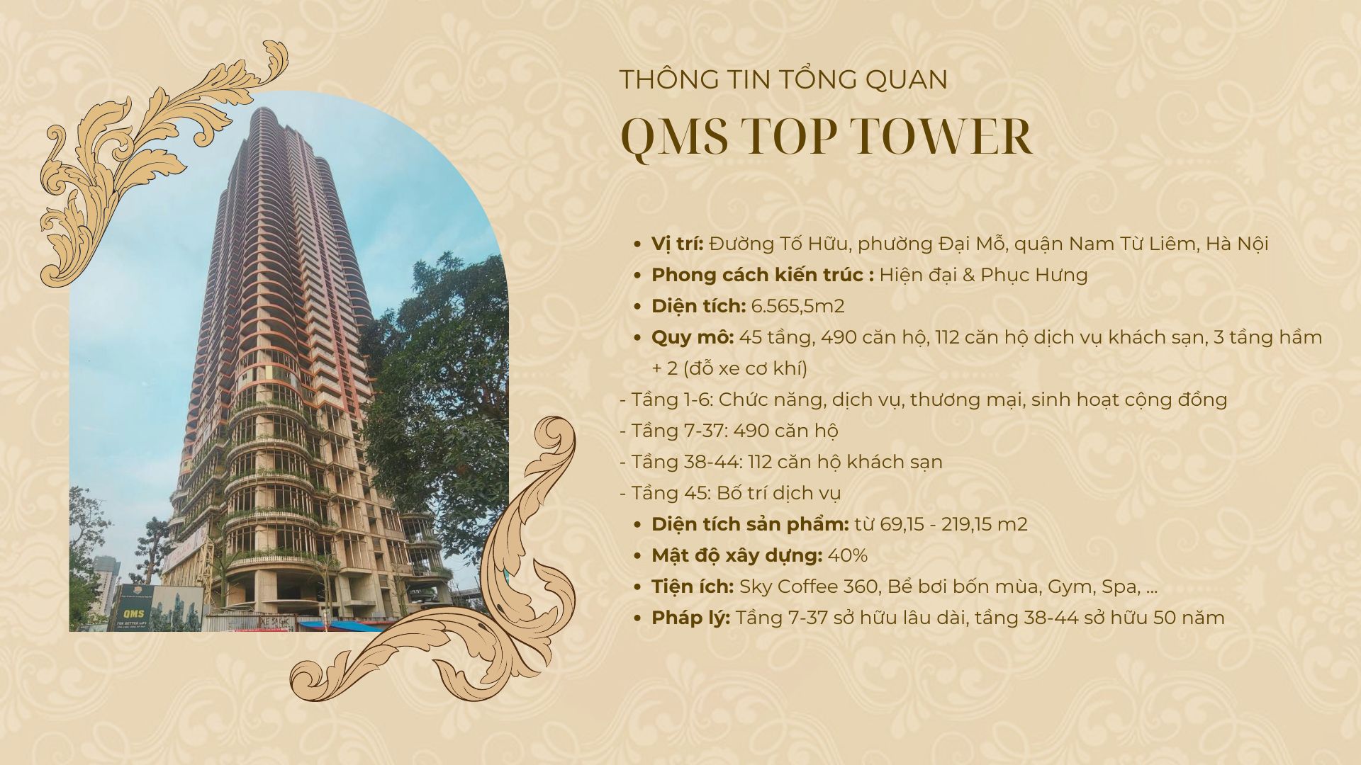 QMS Top Tower Với điểm nhấn về vị trí, độc tôn cửa ngõ phía Tây Nam Hà Nội, thiết kế độc bản, chắt lọc từng đường nét tinh hoa kiến trúc Phục Hưng và tiện ích độc nhất, Dự án QMS Top Tower mở ra không gian sống tiêu chuẩn, hiện đại với các căn hộ sang trọng xứng tầm dành cho các khách hàng.