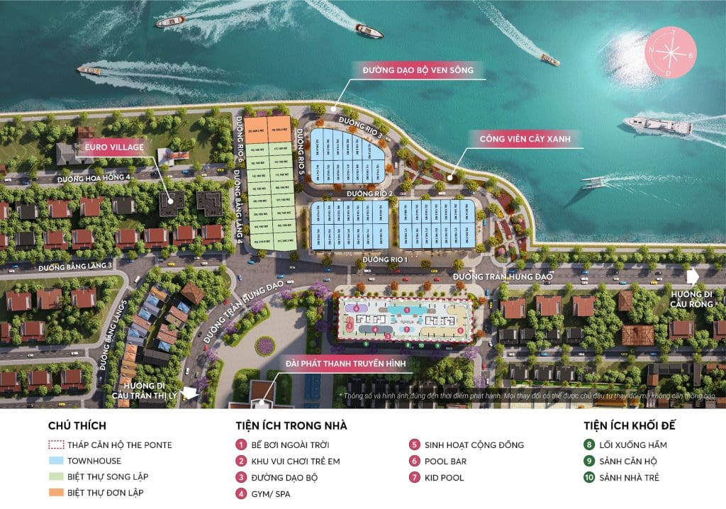 Mặt bằng Sun Ponte Residence được chia thành hai phân khu. Phía Đông dự án, The Ponte là khu căn hộ cao tầng với 2 tháp căn hộ 26 tầng, mang đến tầm view 360 độ đắt giá, ôm trọn vẻ đẹp Đà Nẵng từ mọi góc nhìn. Cư dân tại đây sẽ sống trong không gian thoáng đãng, hưởng trọn vẹn cảnh quan đô thị và thiên nhiên.