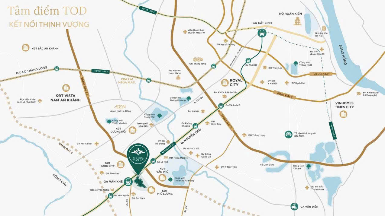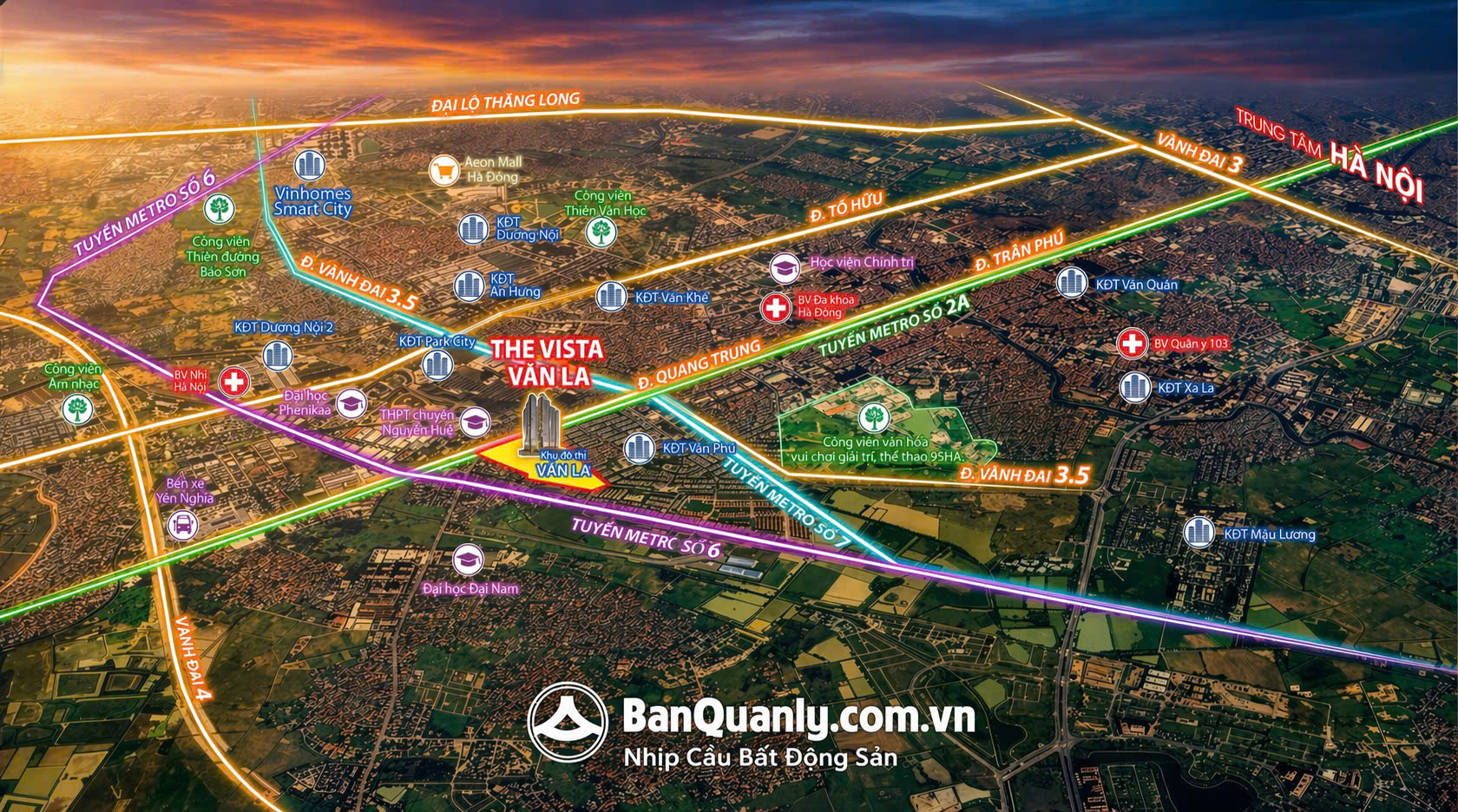 Đánh giá tiềm năng Hà Nội, các chuyên gia SOM dự báo phía Tây sẽ trở thành “hành lang tăng trưởng đô thị” chủ lực trong thập kỷ tới, được thúc đẩy bởi các trục Vành đai 3.5, Vành đai 4 và tuyến Metro: Văn Cao – Hòa Lạc. Cát Linh – Hà Đông – Xuân Mai.Dự án The Vista Văn La không chỉ bởi thiết kế đồng bộ, cao cấp mà còn thừa hưởng đầy đủ tiện ích và dịch vụ có sẵn như Đại siêu thị Metro, trung tâm hành chính Quận Hà Đông, hệ thống giao thông thuận tiện: Đường tàu điện trên cao, tuyến đường xe buýt nhanh BRT… Bên cạnh đó chỉ mất 5 phút đi bộ là cư dân The Vista Văn La nơi đây sẽ đến công viên rộng 100 ha ( có sân gold, khu vui chơi thể thao, trẻ em, hồ điều hòa ) ngay tại dự án được thành phố Hà Nội đang triển khai xây dựng rầm rộ.