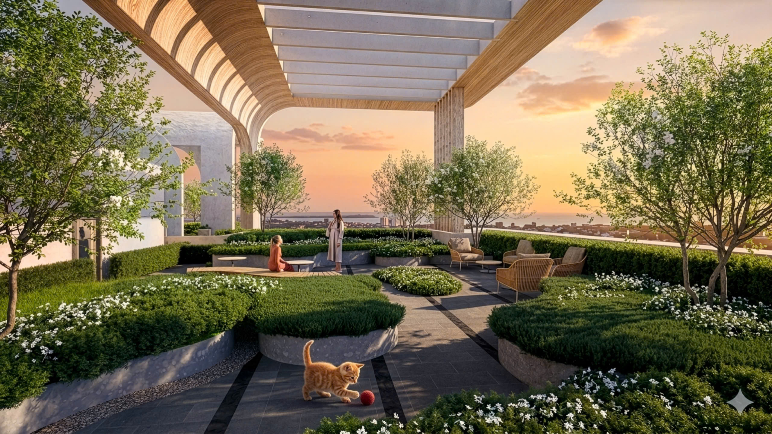 Đường dạo bộ xanh mát, sân vườn trên mái.