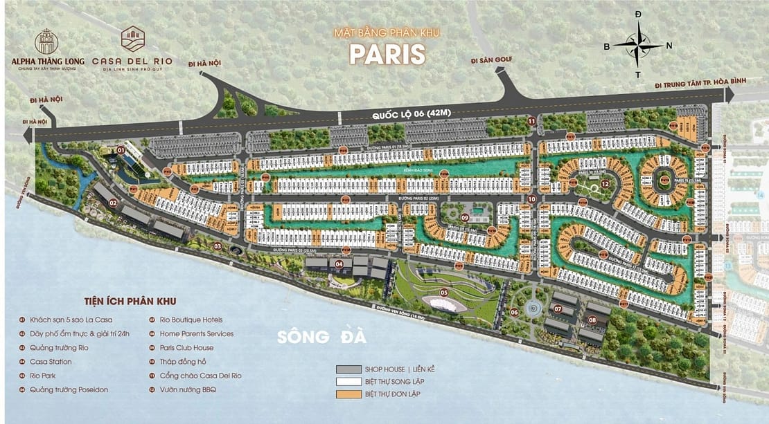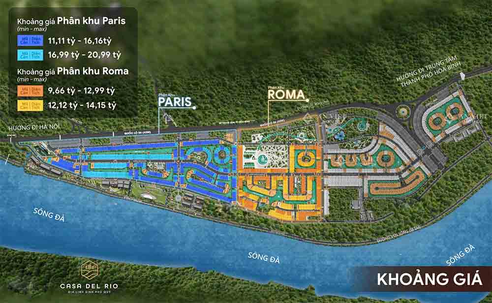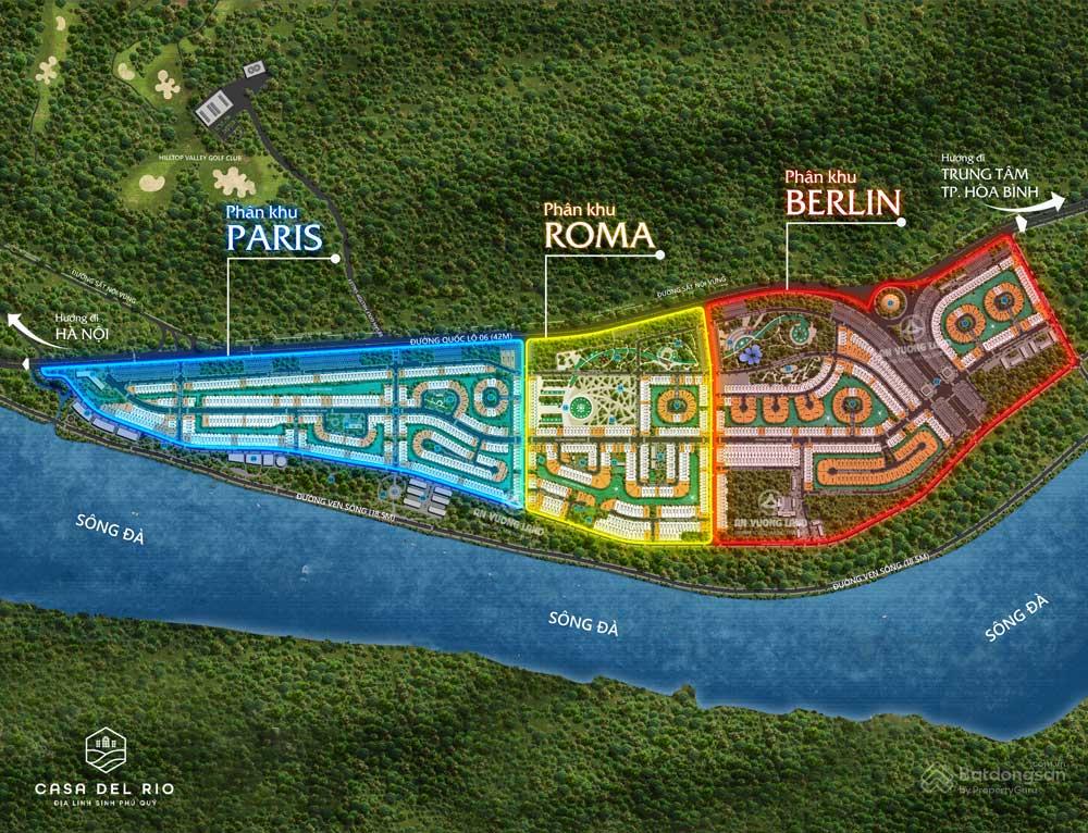 Khu đô thị Casa Del Rio Hòa Bình với 3 phân khu. Các phân khu được đặt tên theo các thủ đô nổi tiếng trên thế giới với bề dầy lịch sử và kiến trúc đầy hoa lệ (Paris, Roma, Berlin)