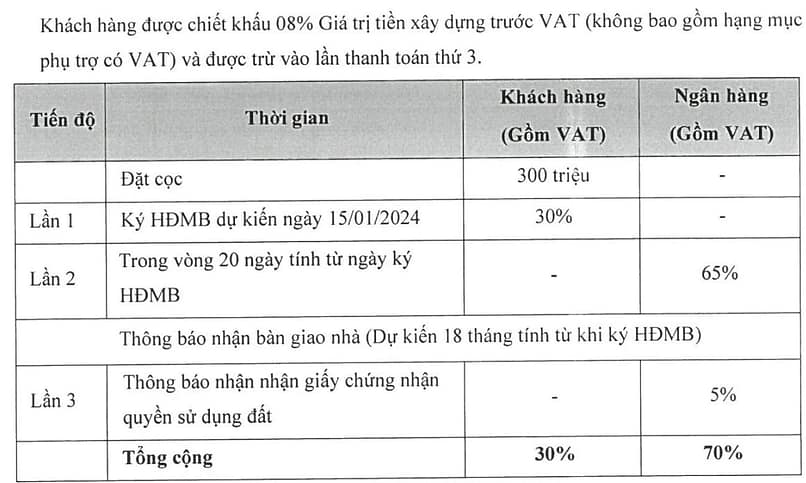 Thanh toán sớm 95% chiết khấu 6% giá trị sản phẩm + 8% giá trị xây dựng.