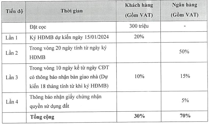1.6 Trong vòng 10 ngày kể từ ngày CĐT thông báo bàn giao nhà (dự kiến 18 tháng từ khi ký HĐMB): 25% giá trị HĐMB.